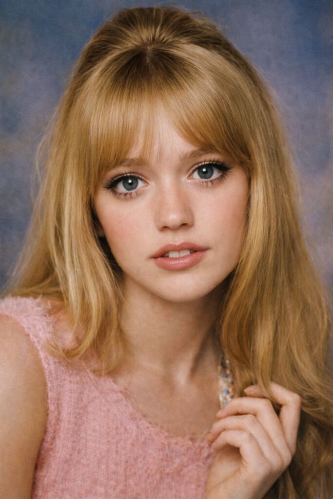 Pattie Boyd’s look in the mid-1960s was inseparable from the era itself. Straight blonde hair with blunt bangs, soft pastels, minimal makeup, and an almost porcelain delicacy that became synonymous with Swinging London.