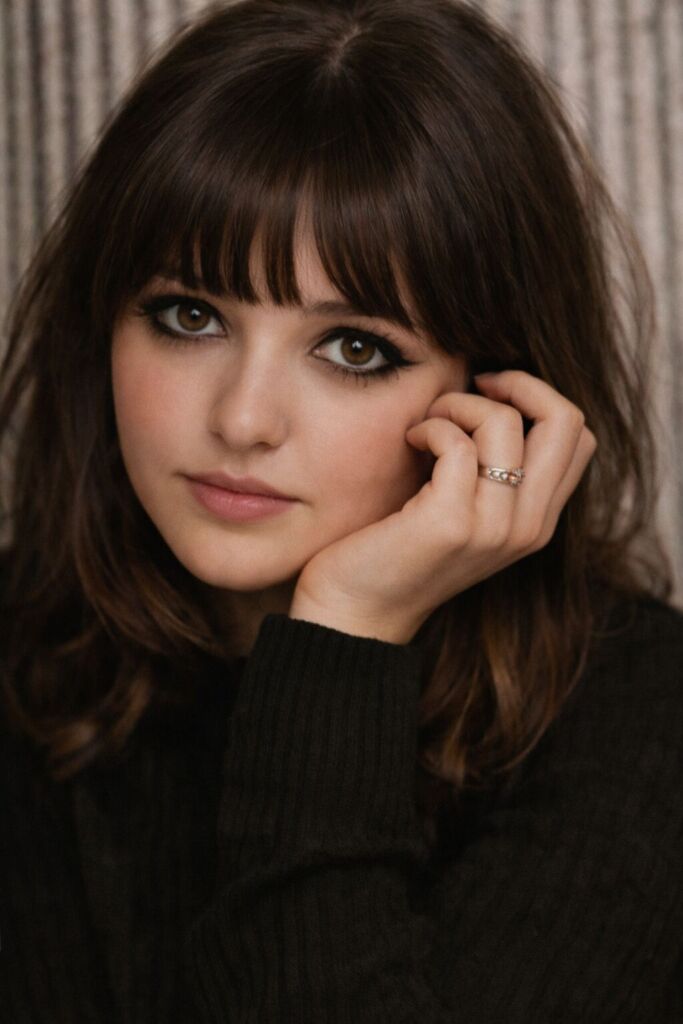 The concept here imagines McKenna-Bruce with heavy fringe, understated makeup, and a monochrome palette. It’s intimate rather than iconic. Less “Beatles wife,” more young woman navigating sudden proximity to fame.